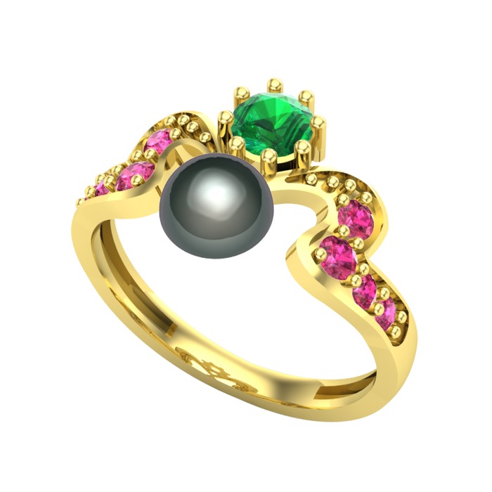 Siyah inci, yeşil kuvars ve rodolit garnet 925 ayar altın kaplama gümüş yüzük
