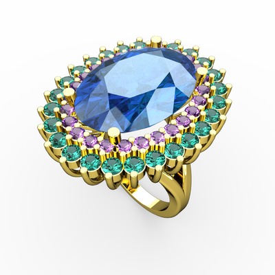 Akuamarin, ametist ve yeşil kuvars 18 ayar altın yüzük