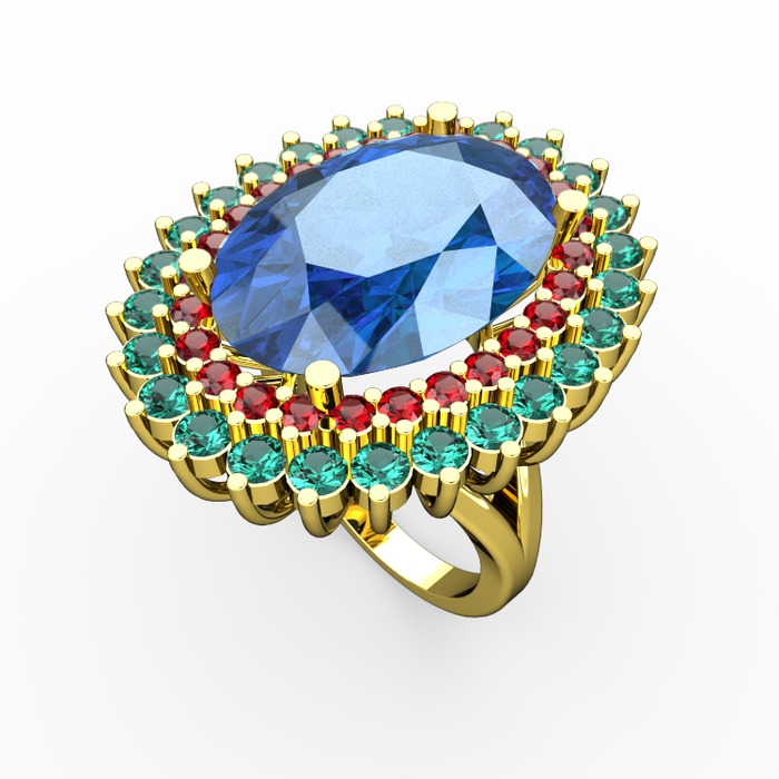 Akuamarin, garnet ve yeşil kuvars 14 ayar altın yüzük