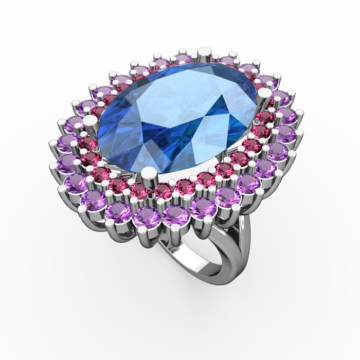 Akuamarin, rodolit garnet ve ametist 14 ayar beyaz altın yüzük