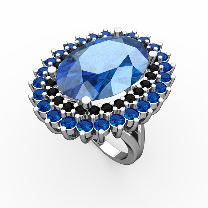 Akuamarin, siyah zirkon ve lab safir 14 ayar beyaz altın yüzük
