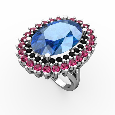 Akuamarin, siyah zirkon ve rodolit garnet 18 ayar beyaz altın yüzük