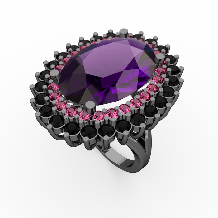 Ametist, rodolit garnet ve siyah zirkon 925 ayar siyah rodyum kaplama gümüş yüzük