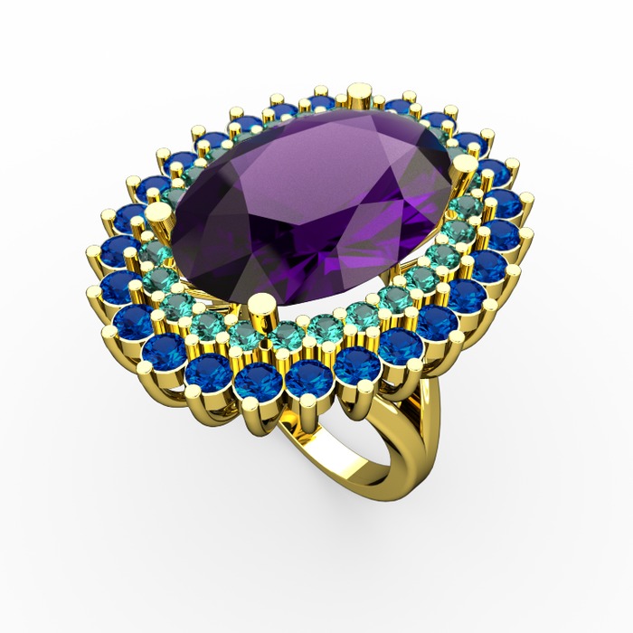 Ametist, yeşil kuvars ve lab safir 14 ayar altın yüzük