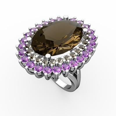 Dumanlı kuvars ve ametist 14 ayar beyaz altın yüzük