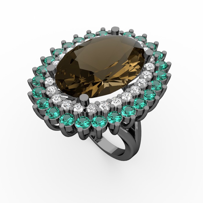 Dumanlı kuvars, beyaz zirkon ve yeşil kuvars 925 ayar siyah rodyum kaplama gümüş yüzük