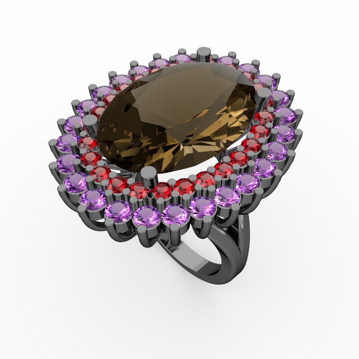 Dumanlı kuvars, garnet ve ametist 925 ayar siyah rodyum kaplama gümüş yüzük