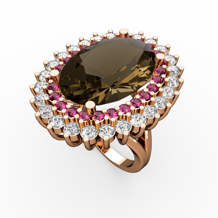 Dumanlı kuvars, rodolit garnet ve swarovski 14 ayar rose altın yüzük