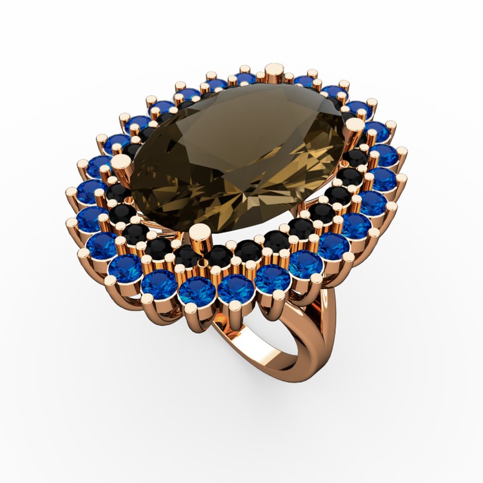 Dumanlı kuvars, siyah zirkon ve lab safir 14 ayar rose altın yüzük