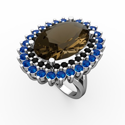 Dumanlı kuvars, siyah zirkon ve lab safir 18 ayar beyaz altın yüzük