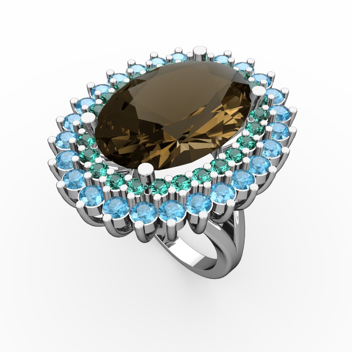 Dumanlı kuvars, yeşil kuvars ve akuamarin 18 ayar beyaz altın yüzük