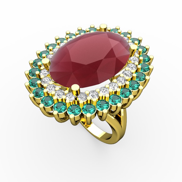 Kök yakut, beyaz zirkon ve yeşil kuvars 925 ayar altın kaplama gümüş yüzük