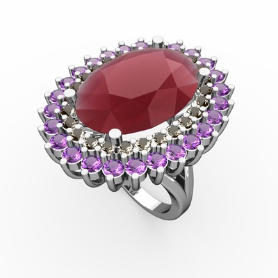 Kök yakut, dumanlı kuvars ve ametist 14 ayar beyaz altın yüzük
