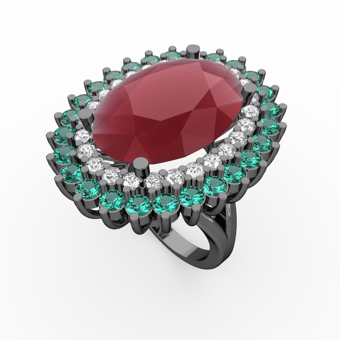 Kök yakut, pırlanta ve yeşil kuvars 925 ayar siyah rodyum kaplama gümüş yüzük (0.936 karat)