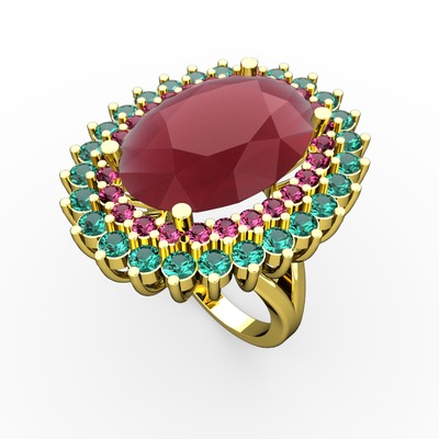 Kök yakut, rodolit garnet ve yeşil kuvars 14 ayar altın yüzük
