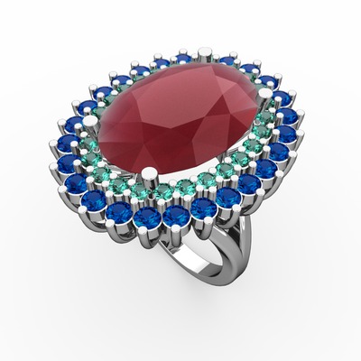 Kök yakut, yeşil kuvars ve lab safir 14 ayar beyaz altın yüzük