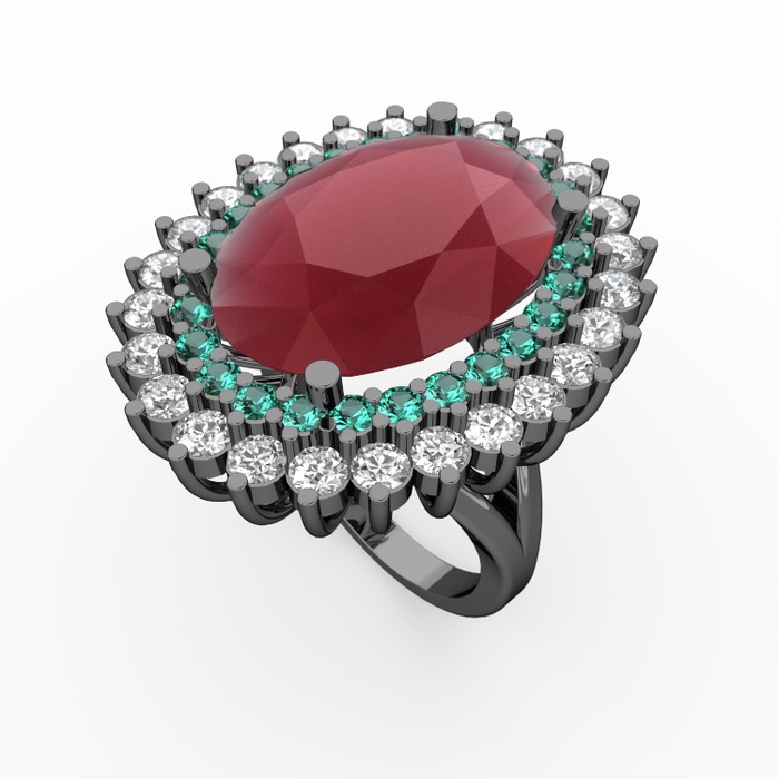 Kök yakut, yeşil kuvars ve swarovski 925 ayar siyah rodyum kaplama gümüş yüzük