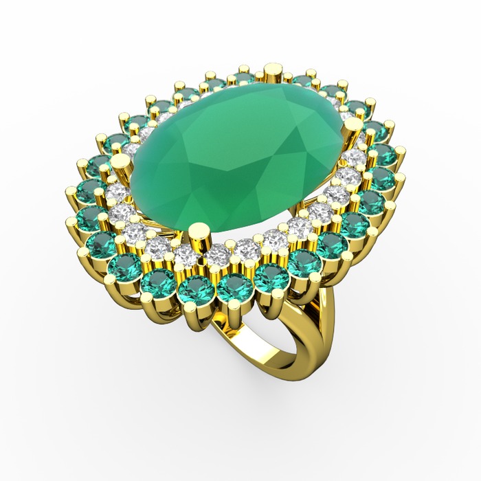 Kök zümrüt, beyaz zirkon ve yeşil kuvars 14 ayar altın yüzük