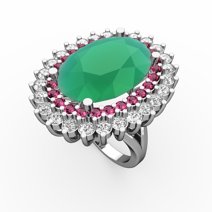 Kök zümrüt, rodolit garnet ve beyaz zirkon 8 ayar beyaz altın yüzük