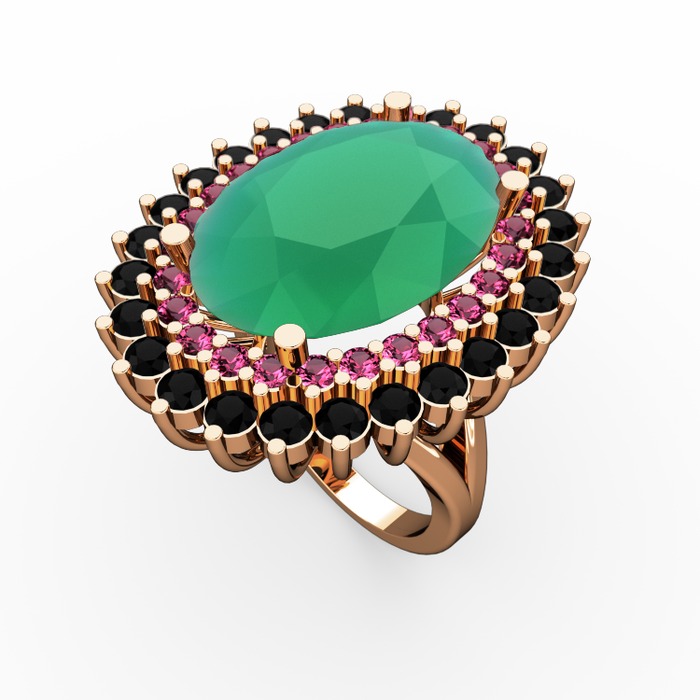 Kök zümrüt, rodolit garnet ve siyah zirkon 18 ayar rose altın yüzük