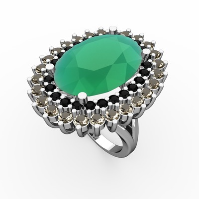 Kök zümrüt, siyah zirkon ve dumanlı kuvars 18 ayar beyaz altın yüzük