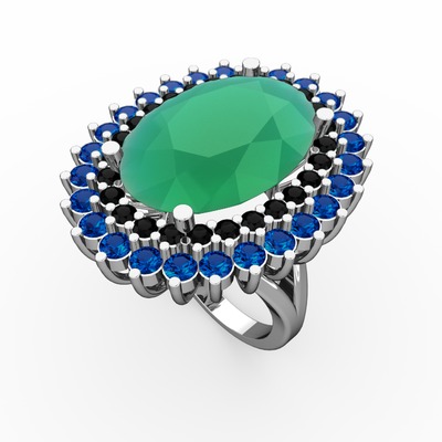 Kök zümrüt, siyah zirkon ve lab safir 18 ayar beyaz altın yüzük
