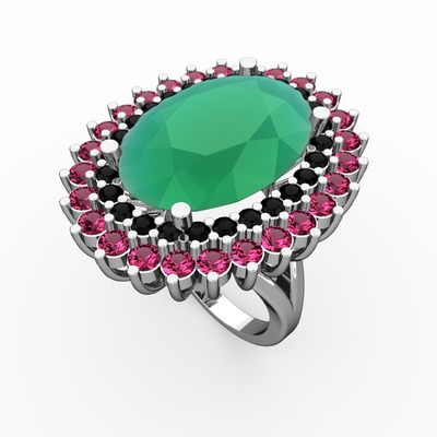 Kök zümrüt, siyah zirkon ve rodolit garnet 18 ayar beyaz altın yüzük