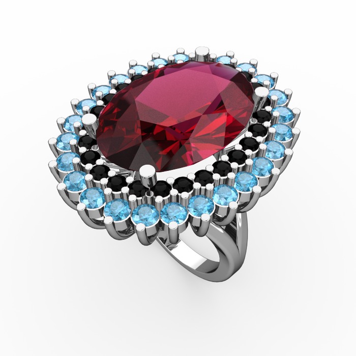 Rodolit garnet, siyah zirkon ve akuamarin 8 ayar beyaz altın yüzük
