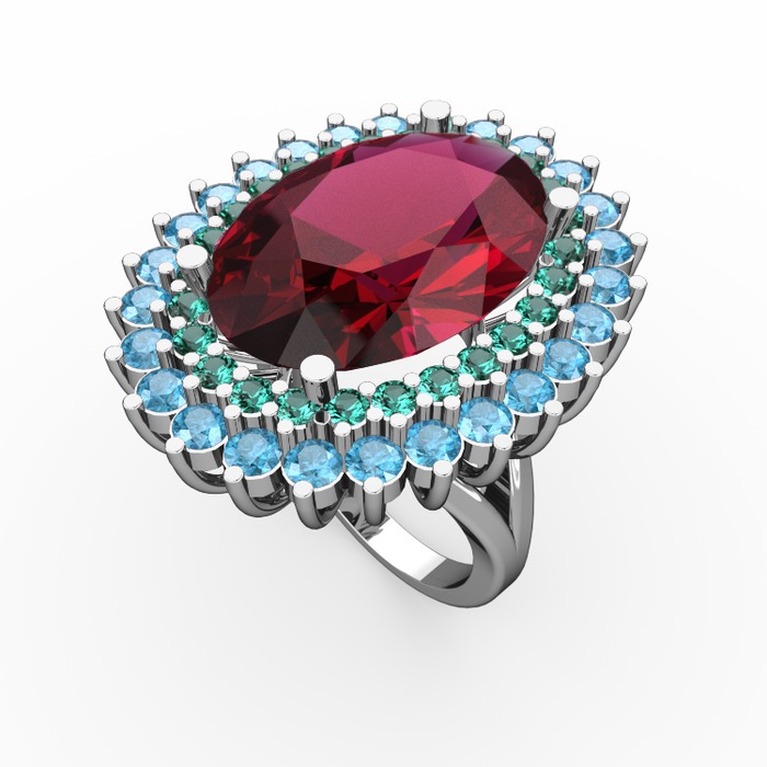 Rodolit garnet, yeşil kuvars ve akuamarin 18 ayar beyaz altın yüzük