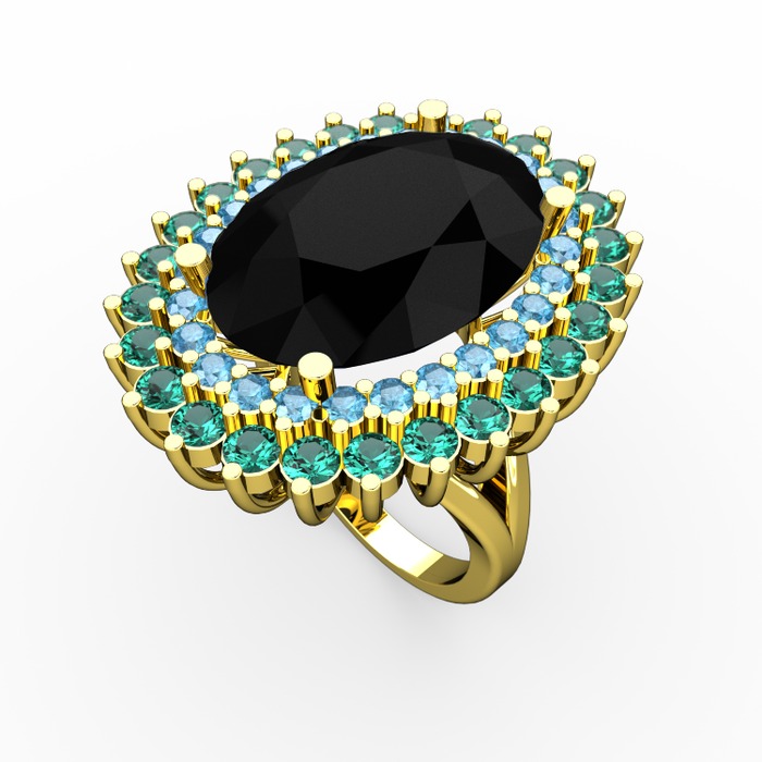 Siyah zirkon, akuamarin ve yeşil kuvars 14 ayar altın yüzük