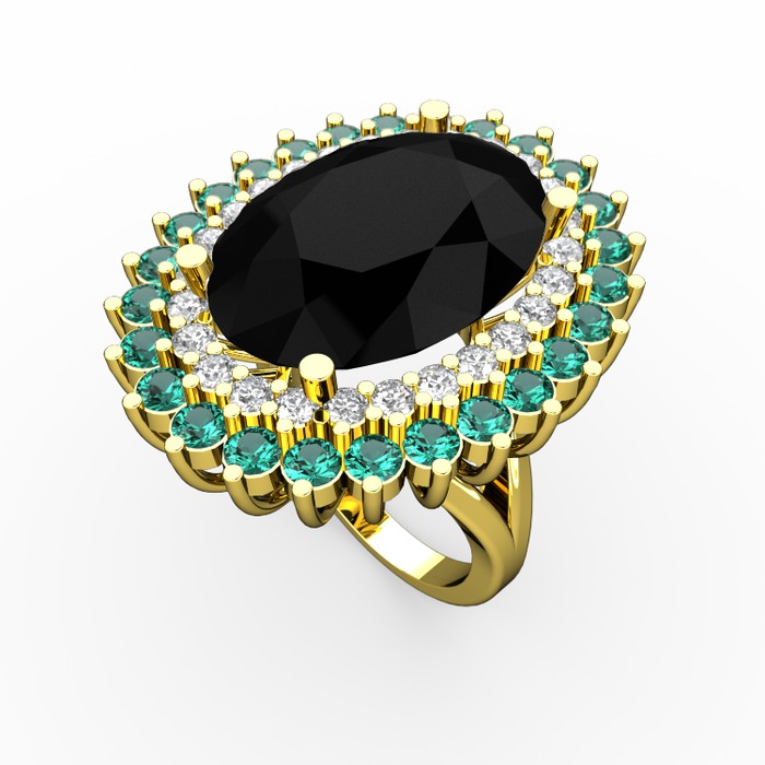 Siyah zirkon, beyaz zirkon ve yeşil kuvars 14 ayar altın yüzük