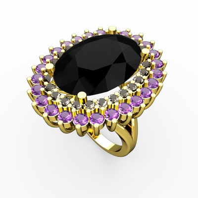 Siyah zirkon, dumanlı kuvars ve ametist 14 ayar altın yüzük