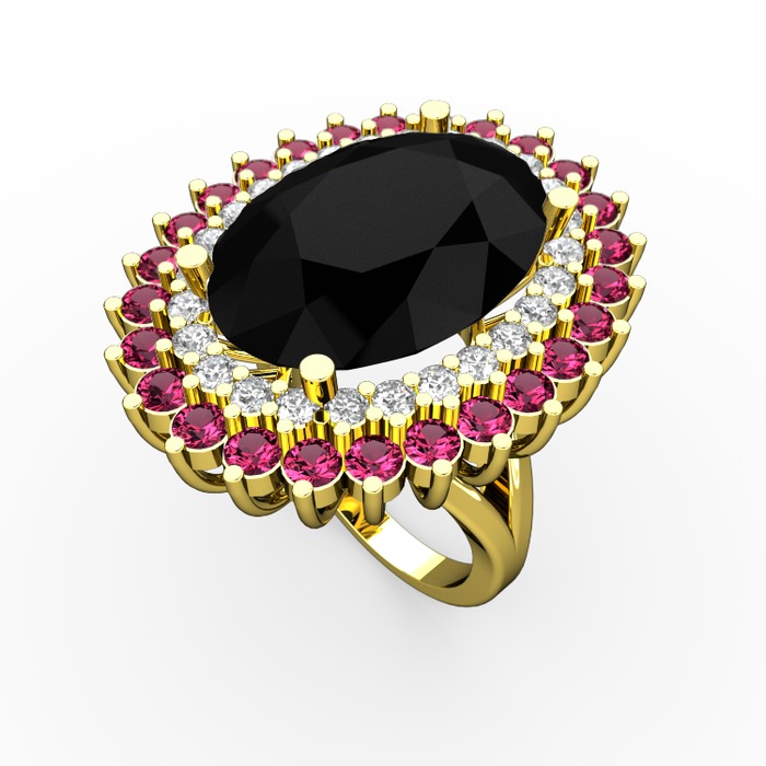 Siyah zirkon, pırlanta ve rodolit garnet 18 ayar altın yüzük (0.936 karat)