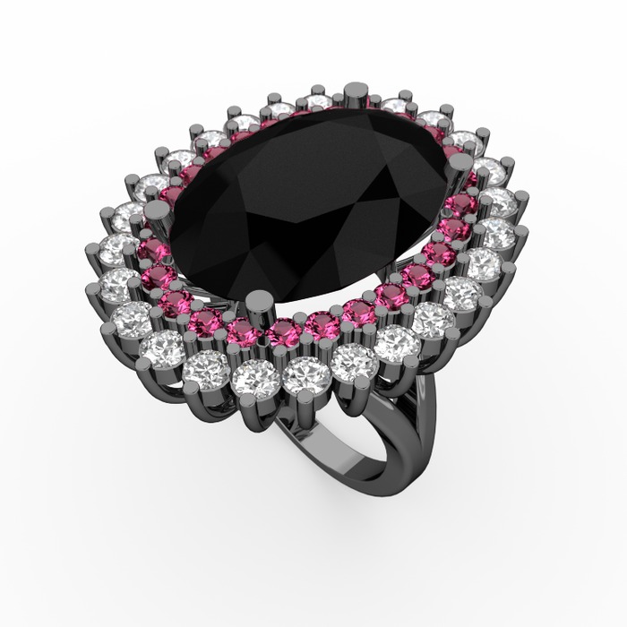 Siyah zirkon, rodolit garnet ve beyaz zirkon 925 ayar siyah rodyum kaplama gümüş yüzük
