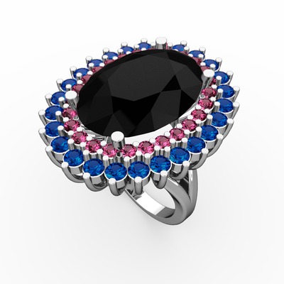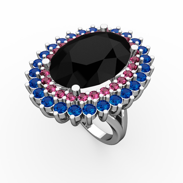 Siyah zirkon, rodolit garnet ve lab safir 8 ayar beyaz altın yüzük