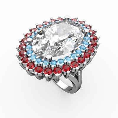 Swarovski, akuamarin ve garnet 14 ayar beyaz altın yüzük