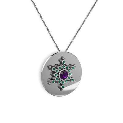 Ametist ve yeşil kuvars 14 ayar beyaz altın kolye (40 cm gümüş rolo zincir)