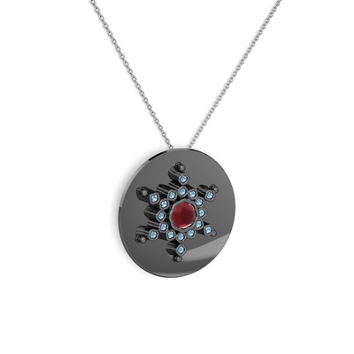 Kök yakut ve akuamarin 925 ayar siyah rodyum kaplama gümüş kolye (40 cm beyaz altın rolo zincir)