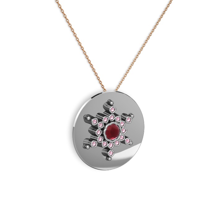 Kök yakut ve pembe kuvars 8 ayar beyaz altın kolye (40 cm rose altın rolo zincir)