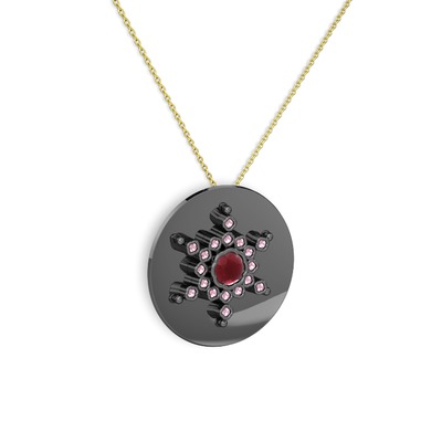 Kök yakut ve pembe kuvars 925 ayar siyah rodyum kaplama gümüş kolye (40 cm altın rolo zincir)