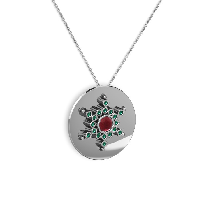 Kök yakut ve yeşil kuvars 18 ayar beyaz altın kolye (40 cm beyaz altın rolo zincir)