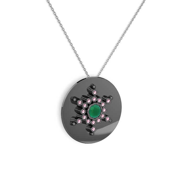Kök zümrüt ve pembe kuvars 925 ayar siyah rodyum kaplama gümüş kolye (40 cm beyaz altın rolo zincir)