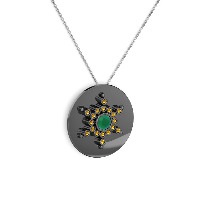 Kök zümrüt ve sitrin 925 ayar siyah rodyum kaplama gümüş kolye (40 cm gümüş rolo zincir)
