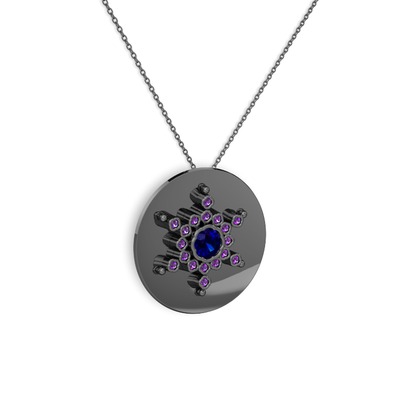 Lab safir ve ametist 925 ayar siyah rodyum kaplama gümüş kolye (40 cm gümüş rolo zincir)