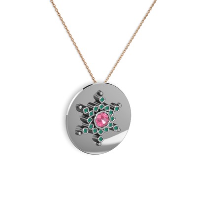 Pembe kuvars ve kök zümrüt 14 ayar beyaz altın kolye (40 cm gümüş rolo zincir)