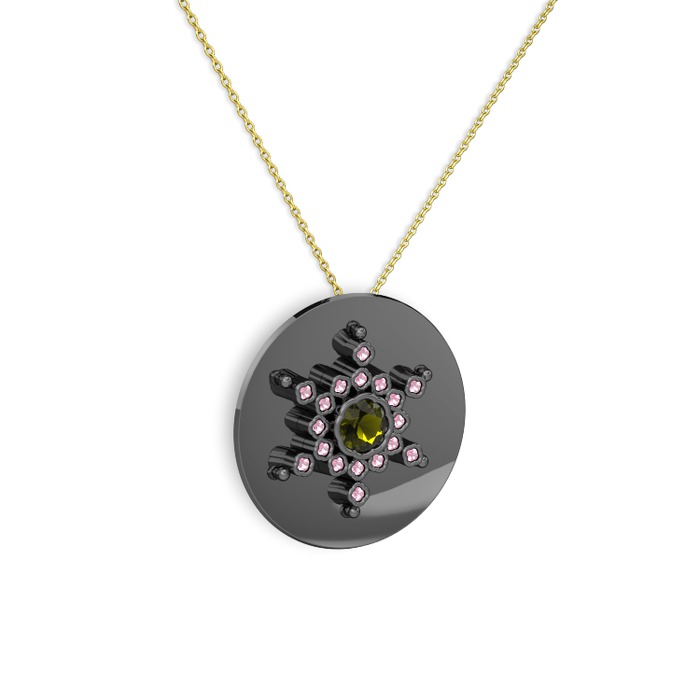 Peridot ve pembe kuvars 925 ayar siyah rodyum kaplama gümüş kolye (40 cm altın rolo zincir)