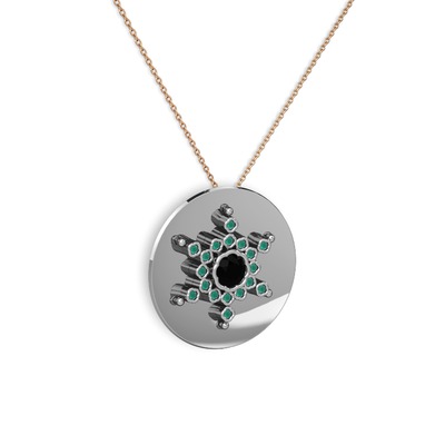 Siyah zirkon ve kök zümrüt 14 ayar beyaz altın kolye (40 cm gümüş rolo zincir)