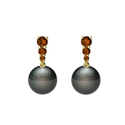 Siyah inci ve dumanlı kuvars 14 ayar altın küpe