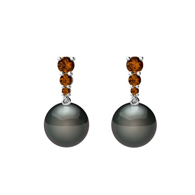 Siyah inci ve dumanlı kuvars 14 ayar beyaz altın küpe