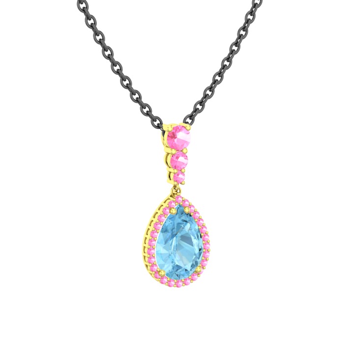 Akuamarin ve pembe kuvars 14 ayar altın kolye (40 cm gümüş rolo zincir)